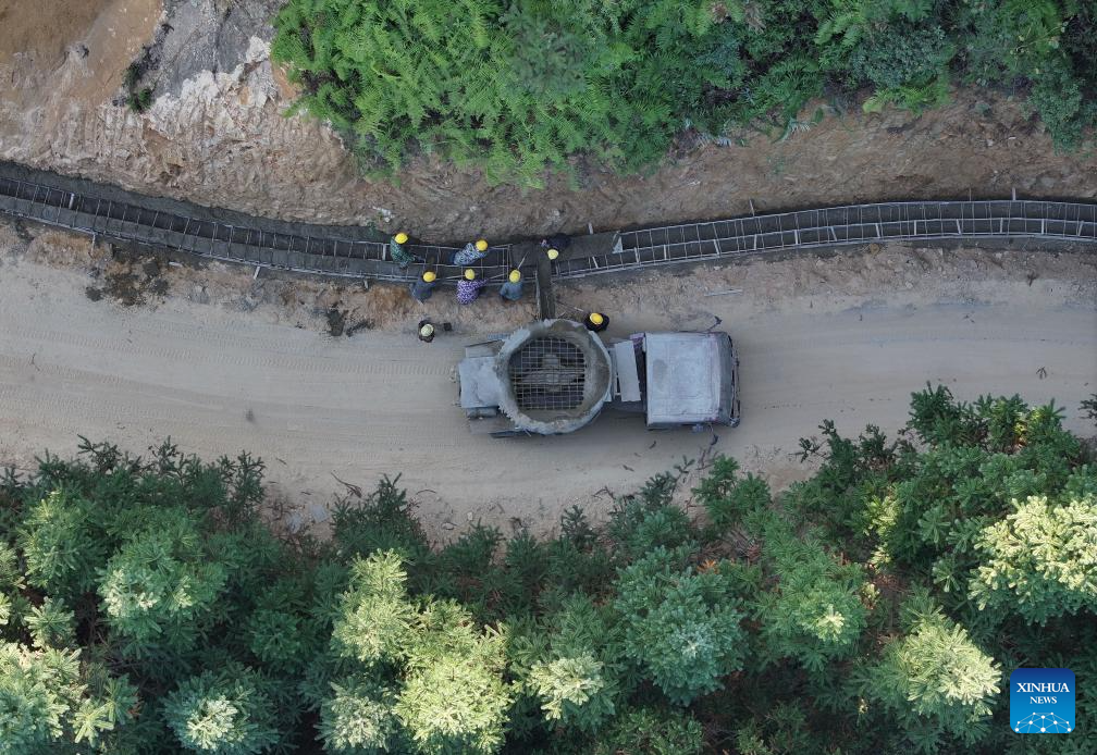 A drone photo shows workers widening a road at Wuying Miao village in Rongshui Miao Autonomous County, south China's Guangxi Zhuang Autonomous Region, Nov. 27, 2025. Recent years saw local authorities in Guangxi boosting the development of tourism in the rural areas through a variety of cultural initiatives. (Xinhua/Huang Xiaobang)