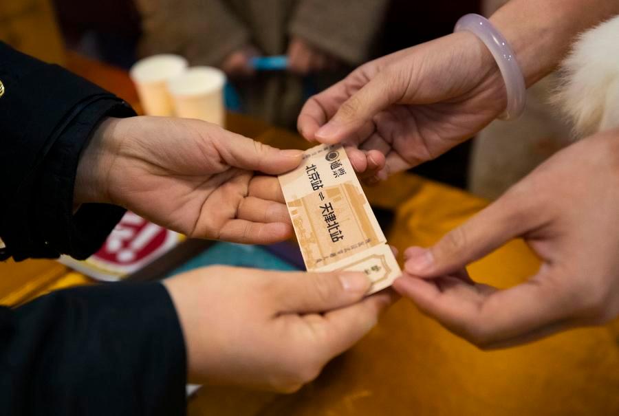 A staff member hands a commemorative ticket to a passenger at the Beijing Railway Station in Beijing, capital of China, Jan. 1, 2026. (Xinhua/Zhang Fan)