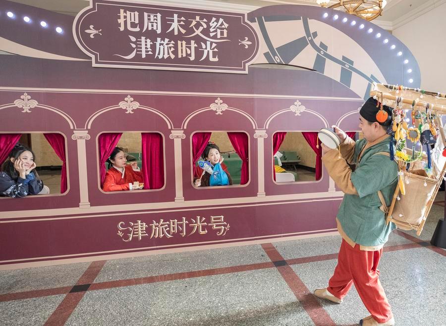 Tourists pose with a billboard at the Beijing Railway Station in Beijing, capital of China, Jan. 1, 2026. (Xinhua/Zhang Fan)