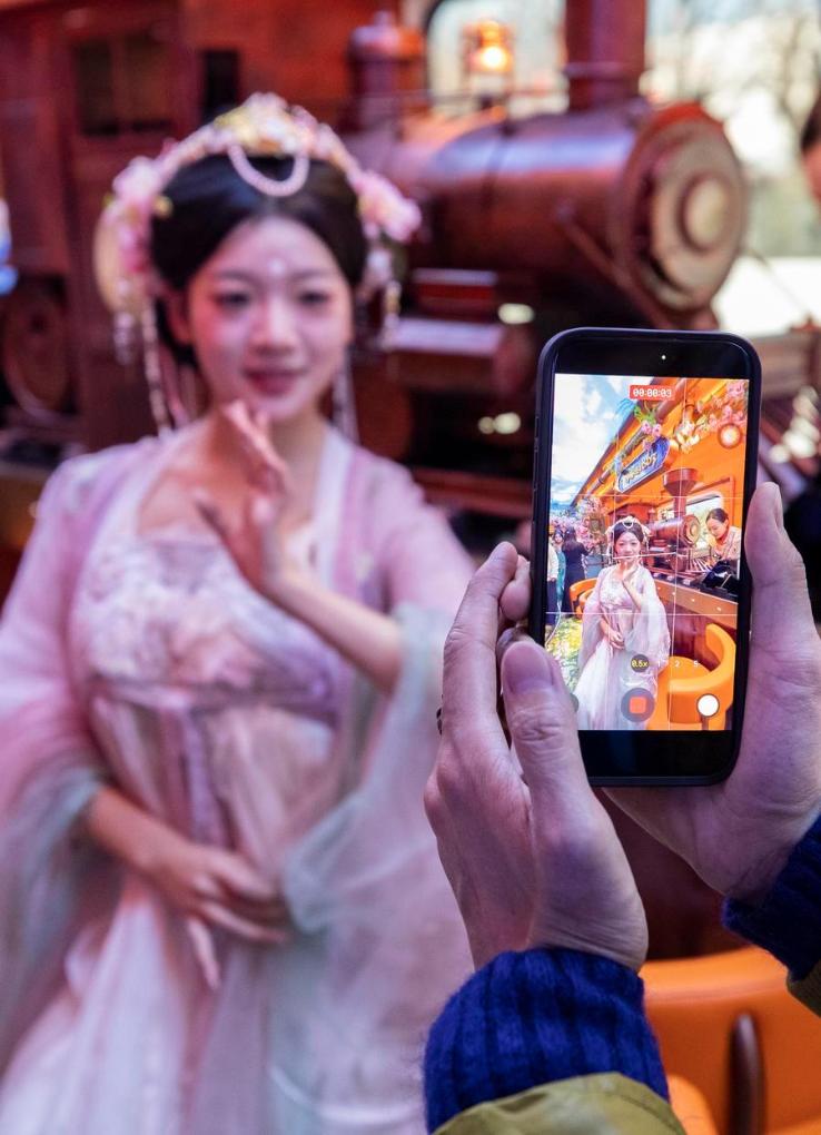 A tourist wearing Hanfu, a traditional Chinese attire, poses on a themed train running from Beijing Railway Station to Tianjin North Railway Station, Jan. 1, 2026. (Xinhua/Zhang Fan)