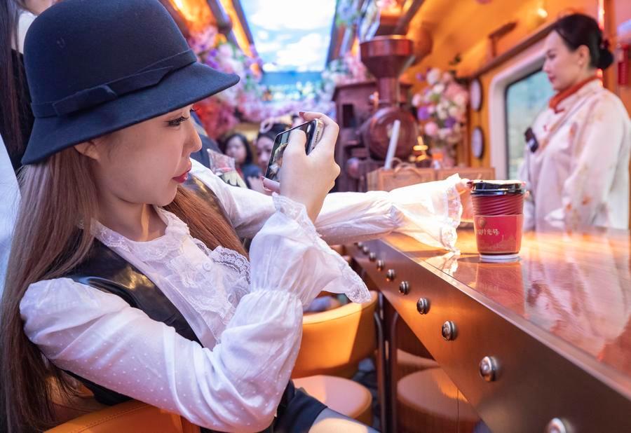 A tourist takes photos on a themed train running from Beijing Railway Station to Tianjin North Railway Station, Jan. 1, 2026. (Xinhua/Zhang Fan)