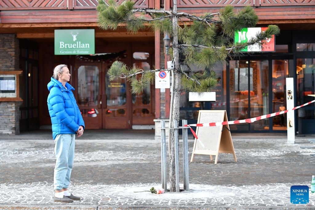 A woman mourns with flowers at the scene of a fire at a bar in the Crans-Montana ski resort in Valais Canton of southwestern Switzerland, Jan. 1, 2026. Around 40 people died and over 110 others were injured after a fire broke out at a bar in the Crans-Montana ski resort, local police said on Thursday. [Photo/Xinhua]