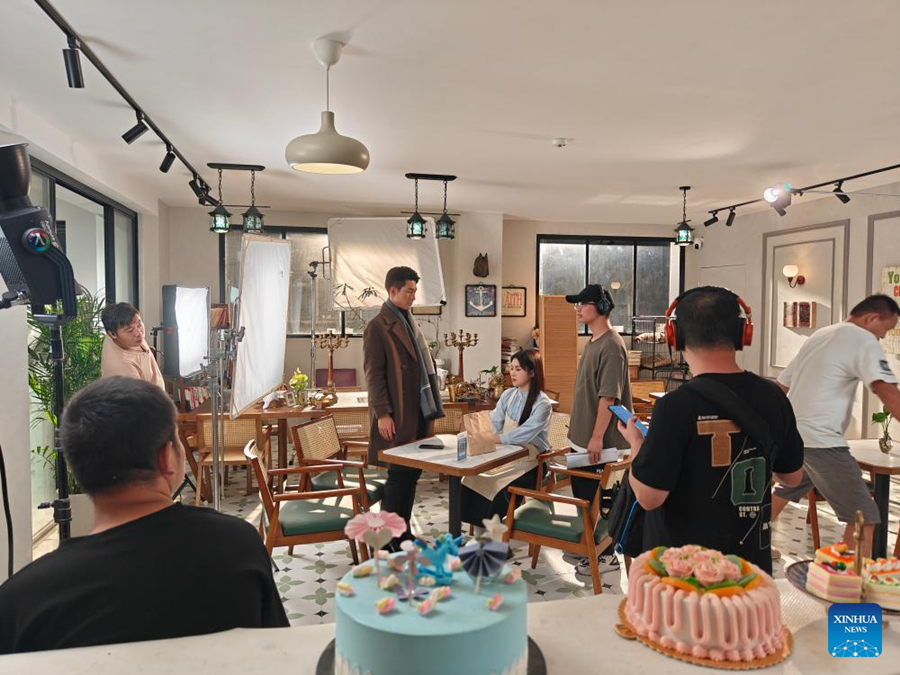 Cast and crew prepare to film a short drama on a set at the Shanghai International Short Video Center in Shanghai. [Photo/Xinhua]