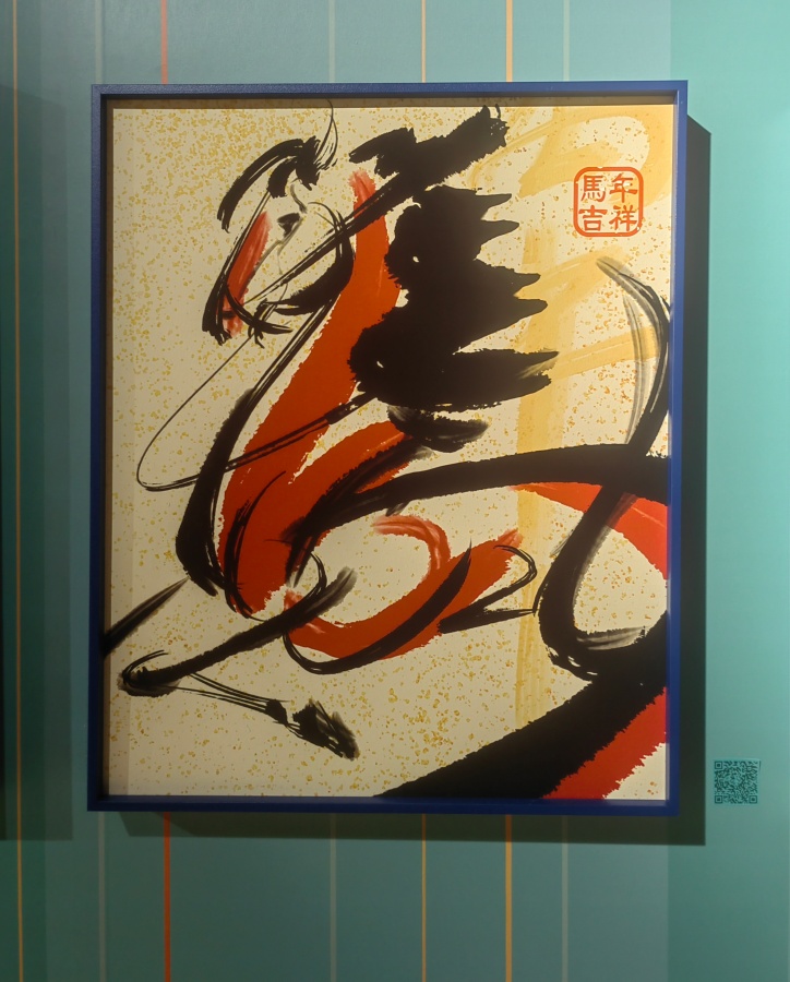 A work by Li Sijie merging traditional Chinese calligraphy strokes for "horse" with graphic design is displayed at the "Global Zodiac Design Competition Invitational Exhibition" for the Year of the Horse at the Beijing Overseas Cultural Exchange Center in Beijing, Jan. 1, 2026. [Photo by Liu Sitong/China.org.cn]