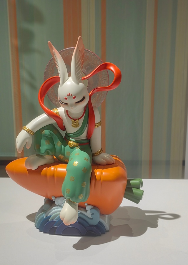 A polyresin rabbit sculpture by Liu Dong, showing the influence of Chinese mythology, is displayed at the "Global Zodiac Design Competition Invitational Exhibition" for the Year of the Horse at the Beijing Overseas Cultural Exchange Center in Beijing, Jan. 1, 2026. This year's exhibition includes all zodiac signs to mark the competition's 12-year history. [Photo by Liu Sitong/China.org.cn]