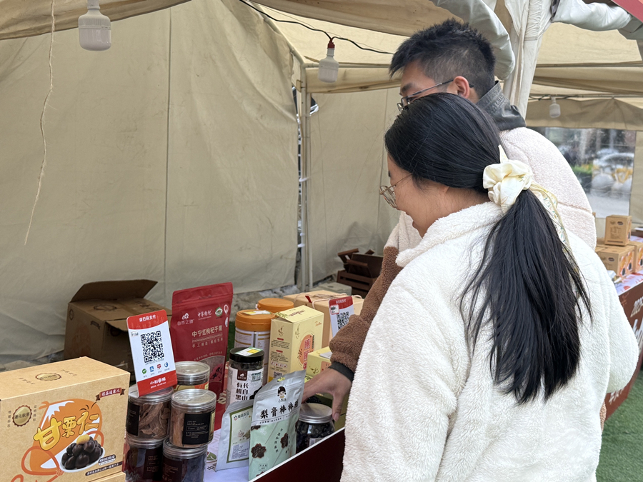 A couple chooses New Year goods at a booth in Beijing, Jan. 1, 2026. [Photo by Liao Jiaxin/China.org.cn]