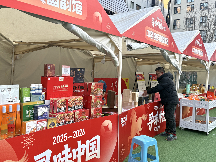 A vendor arranges New Year goods at a booth in Beijing, Jan. 1, 2026. [Photo by Liao Jiaxin/China.org.cn]