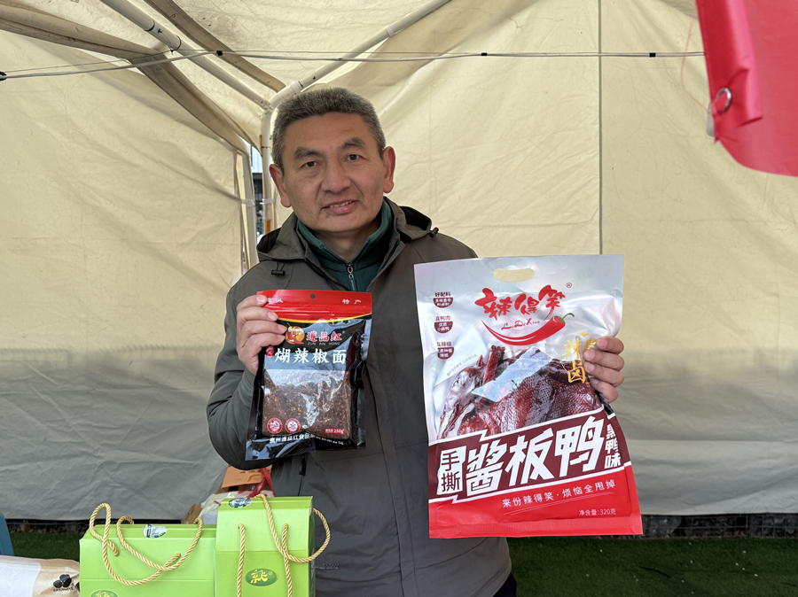 A vendor presents specialty New Year goods from southwest China's Guizhou province in Beijing, Jan. 1, 2026. [Photo by Liao Jiaxin/China.org.cn]