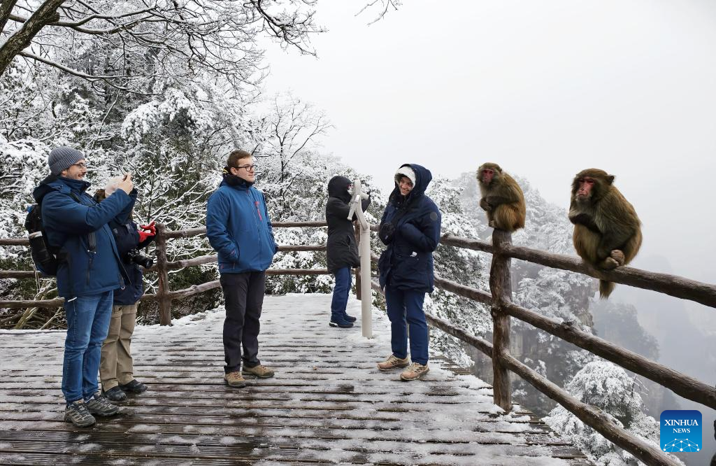 Foreign tourists visit Huangshizhai scenic spot of Zhangjiajie National Forest Park after a snowfall in Zhangjiajie, central China's Hunan Province, Jan. 2, 2026. Snowfall hit many parts of China during the New Year's Day holiday, drawing tourists to enjoy the snowy scenery. (Photo by Wu Yongbing/Xinhua)
