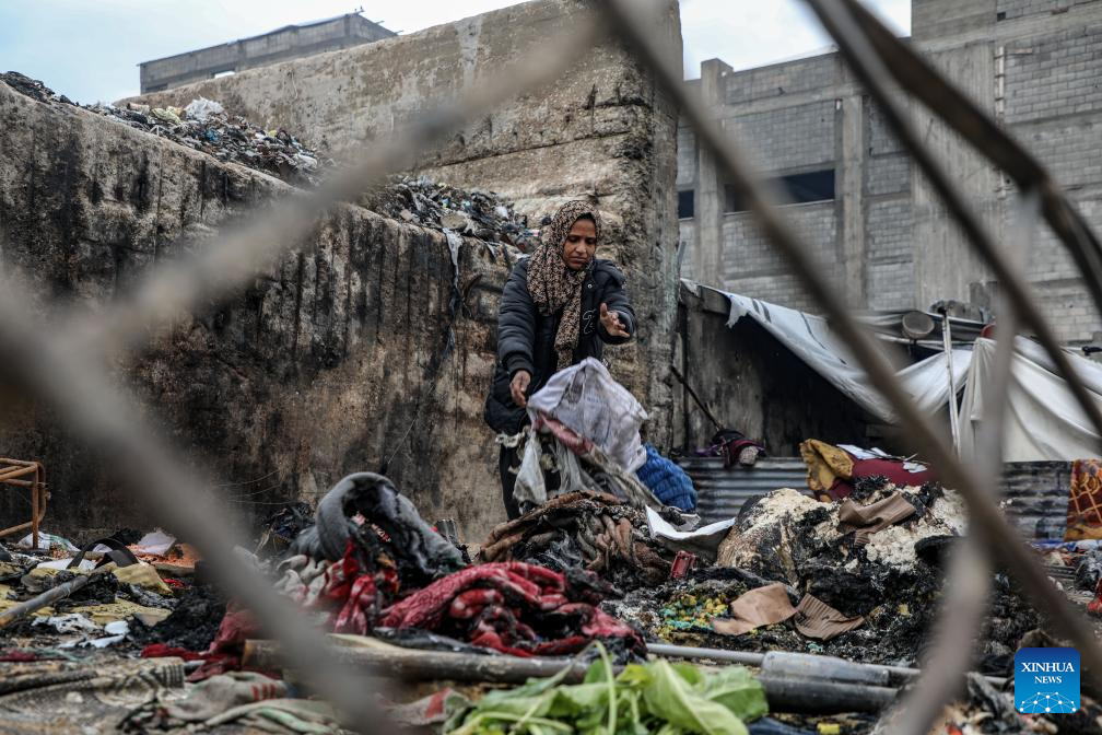 A displaced Palestinian woman inspects the damage to her temporary tent after a fire broke out the previous night, in Gaza City on Jan. 2, 2026. (Photo by Rizek Abdeljawad/Xinhua)