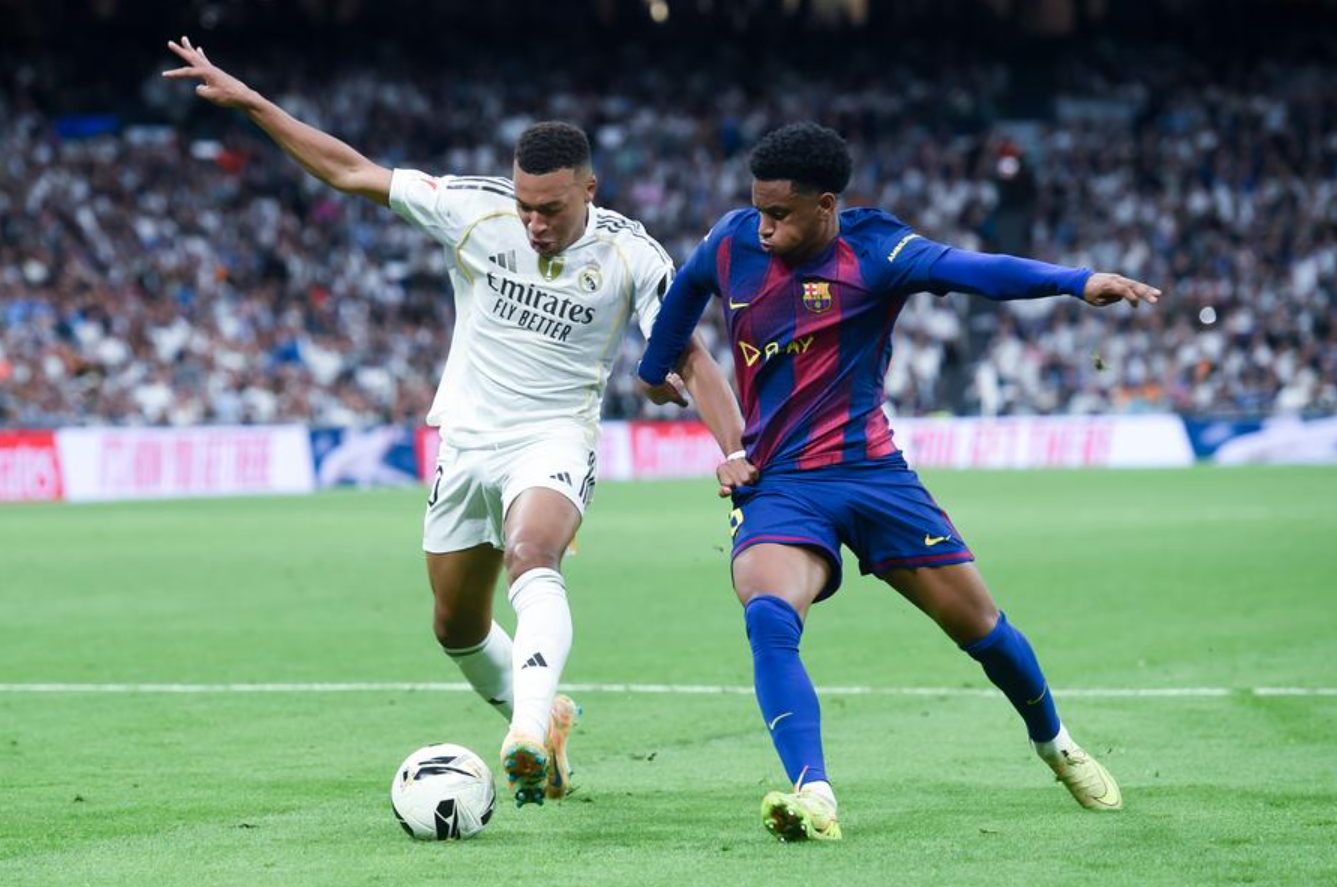 Kylian Mbappe (L) of Real Madrid vies with Alex Balde of Barcelona during their La Liga match at Santiago Bernabeu Stadium in Madrid, Spain, on Oct. 26, 2025. (Xinhua/Gustavo Valiente)