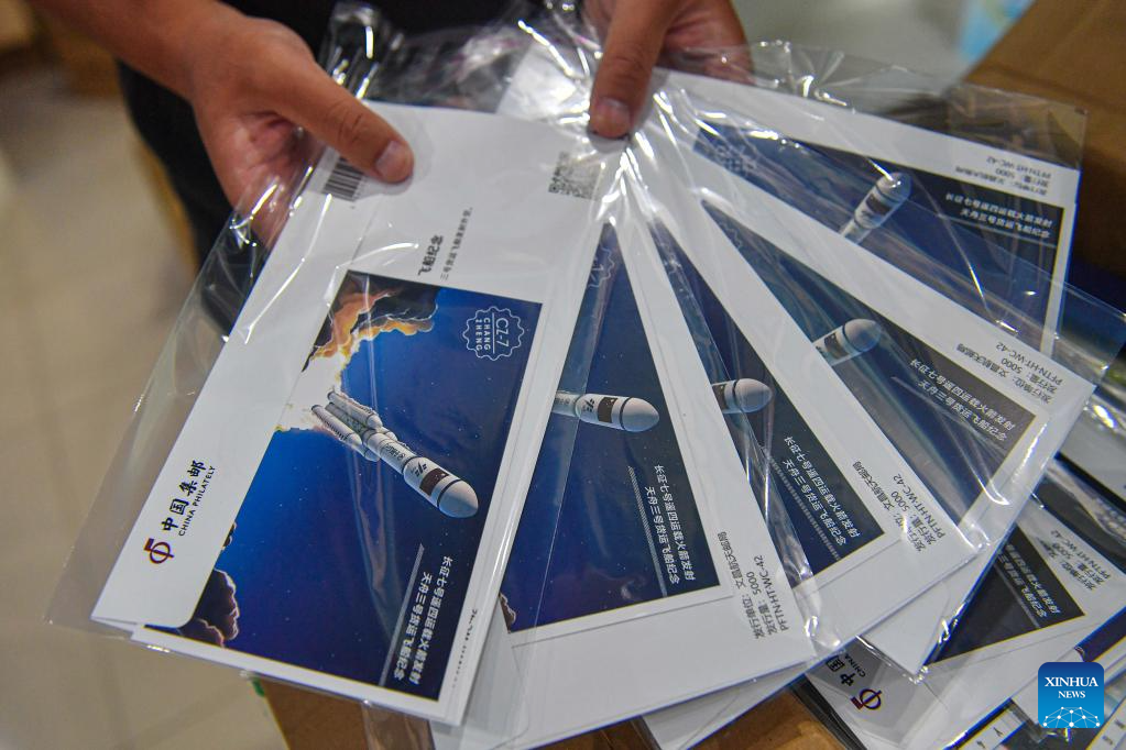 Yang Hao, an aerospace enthusiast, shows the aerospace commemorative philatelic collections he purchased in Wenchang, south China's Hainan Province, Sept. 19, 2021. (Xinhua/Pu Xiaoxu)