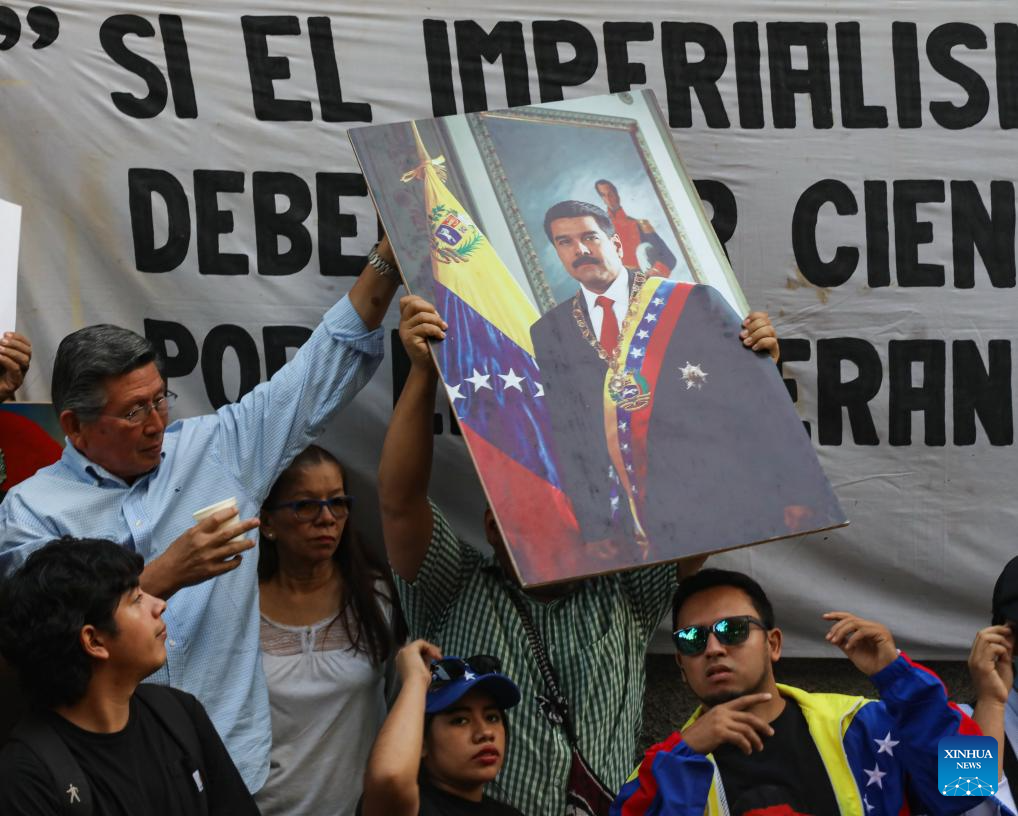 People protest against U.S. strikes on Venezuela and its capture of Venezuelan President Nicolas Maduro and his wife, in San Salvador, El Salvador, on Jan. 3, 2026. [Photo/Xinhua]