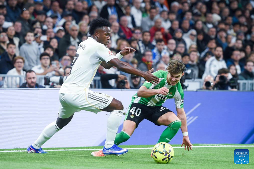 Real Madrid's Vinicius Junior (L) vies with Real Betis' Angel Ortiz during a La Liga football match between Real Madrid and Real Betis at Santiago Bernabeu stadium in Madrid, Spain, on Jan. 4, 2026. (Photo by Gustavo Valiente/Xinhua)