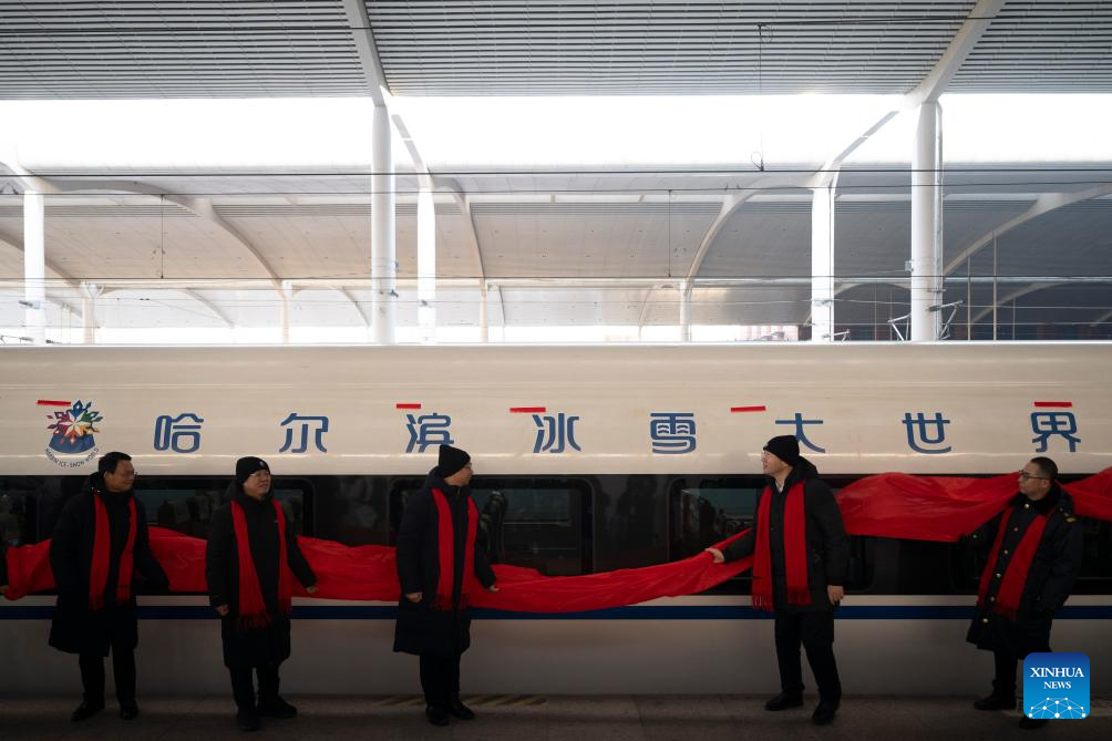 This photo taken on Jan. 4, 2026 shows the unveiling ceremony of the bullet train No. G1276, the first themed high-speed train of the Harbin Ice-Snow World, at Harbin West Station in Harbin, northeast China's Heilongjiang Province. The first high-speed train with the theme of the Harbin Ice-Snow World began service from Harbin West Station on Sunday, heading for Wuhan City in central China's Hubei Province. Featuring unique interior and exterior decorations of the Harbin Ice-Snow World, the themed high-speed train serves as a mobile emblem to boost the ice and snow economy. (Xinhua/Zhang Tao)