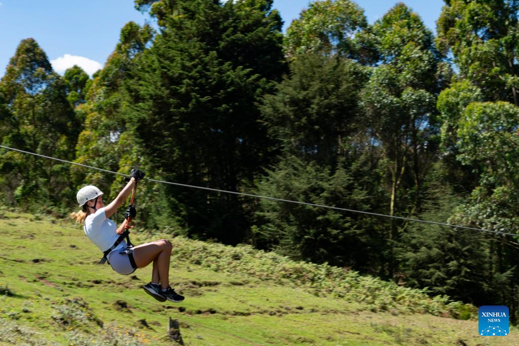 A woman experiences cable flying in a forest in Kiambu County, Kenya, Jan. 3, 2026. (Xinhua/Xie Jianfei)
