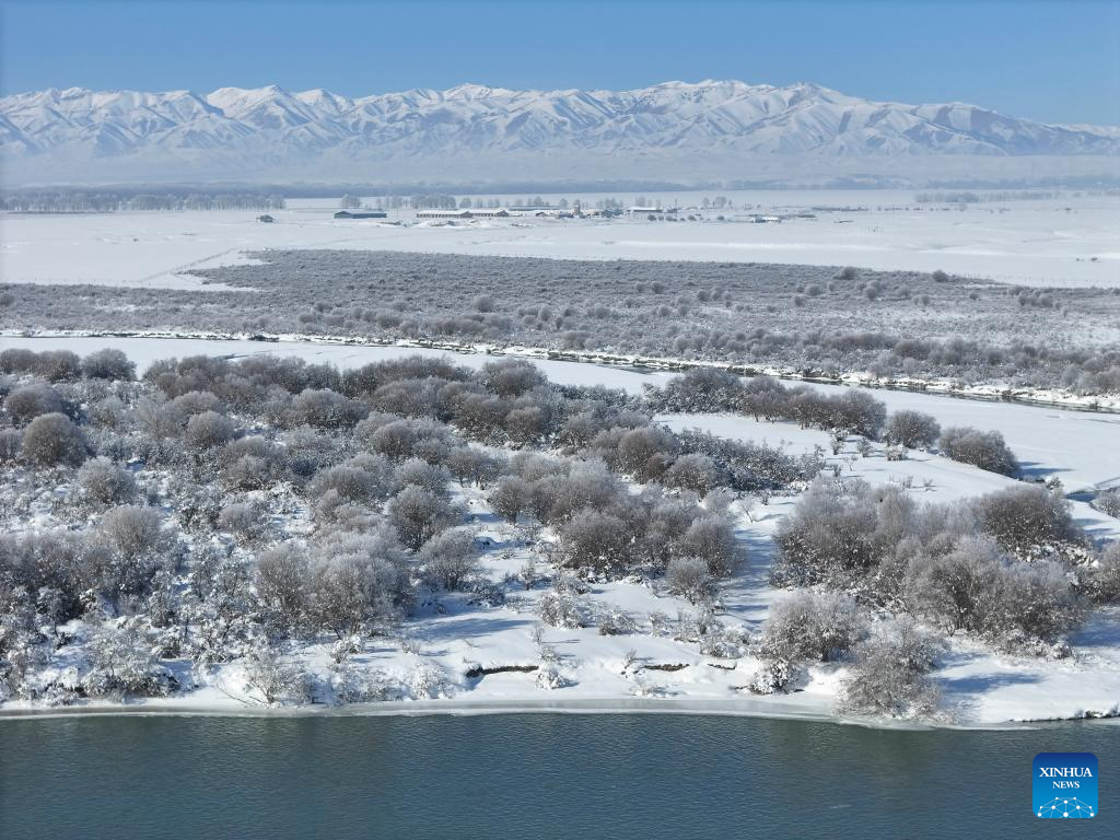 An aerial drone photo taken on Jan. 3, 2026 shows a view of a wetland park in Zhaosu County, Ili Kazak Autonomous Prefecture, northwest China's Xinjiang Uygur Autonomous Region. Leveraging its unique ice and snow resources in winter, Zhaosu County has developed diverse winter tourist services to attract visitors. (Xinhua/Hu Huhu)