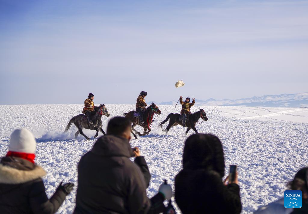 这是1月3日在新疆昭苏湿地公园拍摄的传统民俗“叼羊”表演。寒冬时节,新疆昭苏县一片银装素裹。当地借助独特冰雪资源,开发冰雪乐园、“天马踏雪”等冰雪旅游产品,吸引各地游客前来游玩。[新华社记者 徐宏岩 摄]