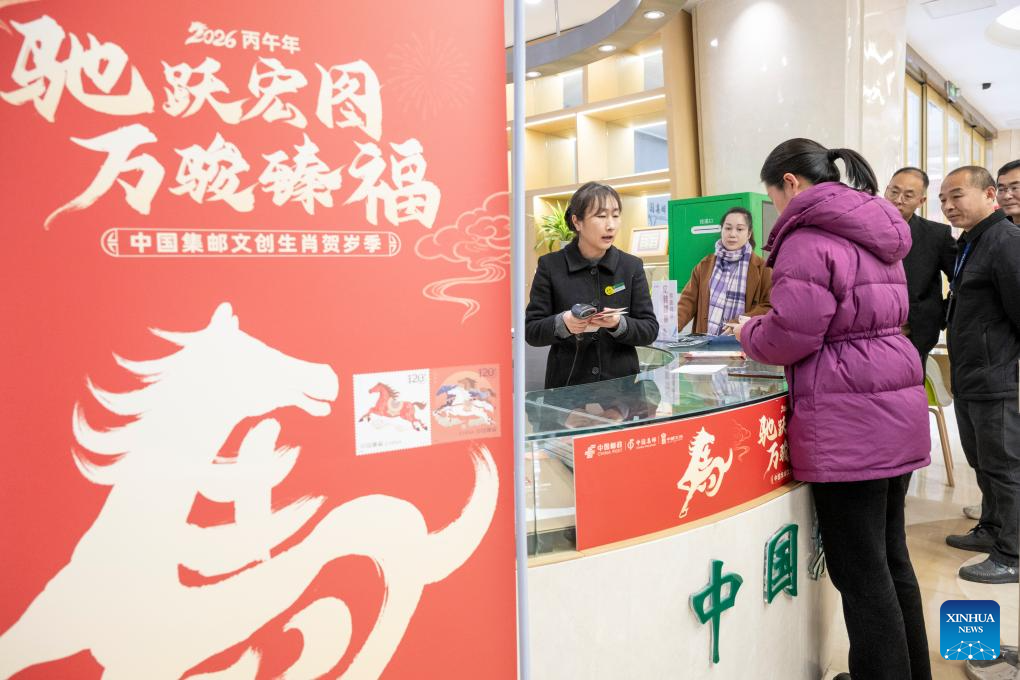 People buy special stamps marking the Year of the Horse in Suqian, east China's Jiangsu Province, Jan. 5, 2026. China Post on Monday unveiled a set of two special stamps to celebrate the upcoming Chinese zodiac Year of the Horse. (Photo by Ma Haifeng/Xinhua)