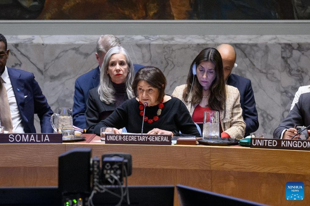 UN Under-Secretary-General for Political Affairs Rosemary DiCarlo (C, front) speaks at an emergency meeting of the Security Council on behalf of UN Secretary-General Antonio Guterres, at the UN headquarters in New York, Jan. 5, 2026. [Photo/Xinhua]