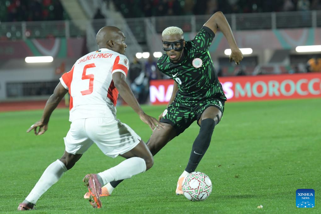 Mozambique's Bruno Alberto Langa (L) competes against Nigeria's Victor Osimhen during the Africa Cup of Nations round of 16 football match between Nigeria and Mozambique in Fes, Morocco, Jan. 5, 2026. (Photo by Aissa/Xinhua)
