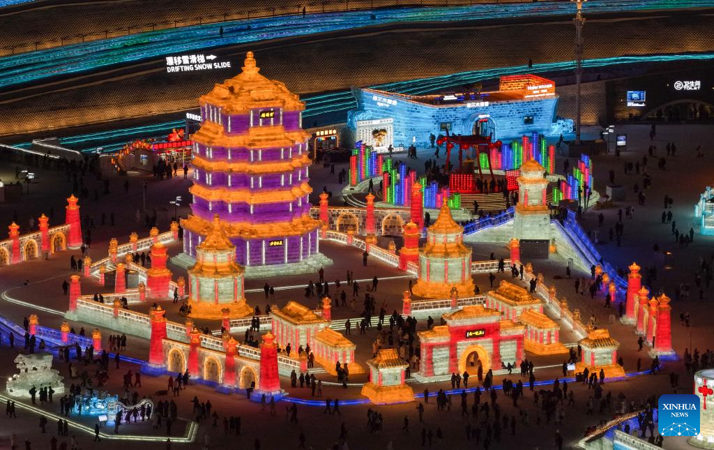 An aerial drone photo taken on Jan. 5, 2026 shows a view of the Harbin Ice-Snow World in Harbin, northeast China's Heilongjiang Province. The 42nd Harbin International Ice and Snow Festival kicked off at the Harbin Ice-Snow World here on Monday. (Xinhua/Wang Song)