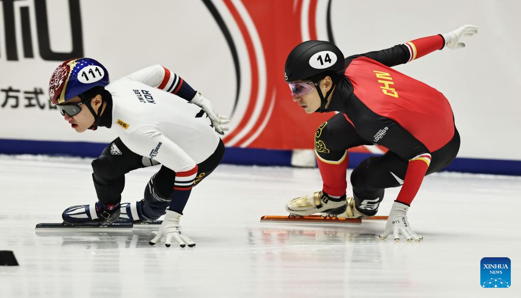 Liu Shaoang (R) of team China competes during the Mixed Team relay Final A at the ISU Short Track World Tour #3 speed skating event in Gdansk, Poland, Nov. 23, 2025. (Xinhua/Gao Jing)