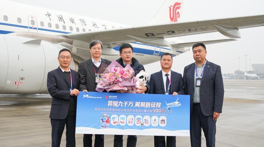 Mr. Jiang (C), the 90 millionth passenger of the Chengdu International Aviation Hub in 2025, poses for a photo with the airport staff members at the Chengdu Shuangliu International Airport in Chengdu, southwest China's Sichuan Province, on Dec. 31, 2025. [Photo/Xinhua]