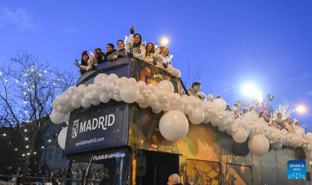 People on a float toss candies to the crowd during a parade celebrating Three Kings Day in Madrid, Spain on Jan. 5, 2026. A grand Three Kings Day float parade was held in Madrid on Monday, drawing thousands of people to watch. (Xinhua/Cheng Min)