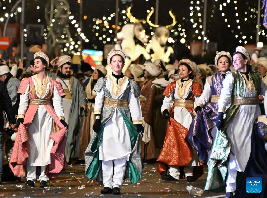 Performers take part in a parade celebrating Three Kings Day in Madrid, Spain on Jan. 5, 2026. A grand Three Kings Day float parade was held in Madrid on Monday, drawing thousands of people to watch. (Xinhua/Cheng Min)