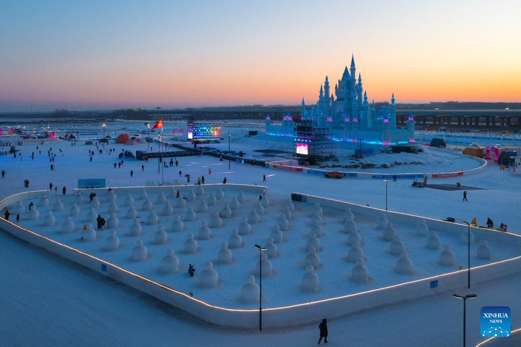This aerial drone photo taken on Jan. 5, 2026 shows a park in Changchun, northeast China's Jilin Province. Changchun has set up a variety of distinctive ice and snow landscapes throughout urban areas this winter to lure tourists and encourage consumption. (Xinhua/Xu Chang)