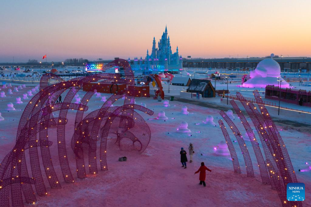 This aerial drone photo taken on Jan. 5, 2026 shows a park in Changchun, northeast China's Jilin Province. Changchun has set up a variety of distinctive ice and snow landscapes throughout urban areas this winter to lure tourists and encourage consumption. (Xinhua/Xu Chang)