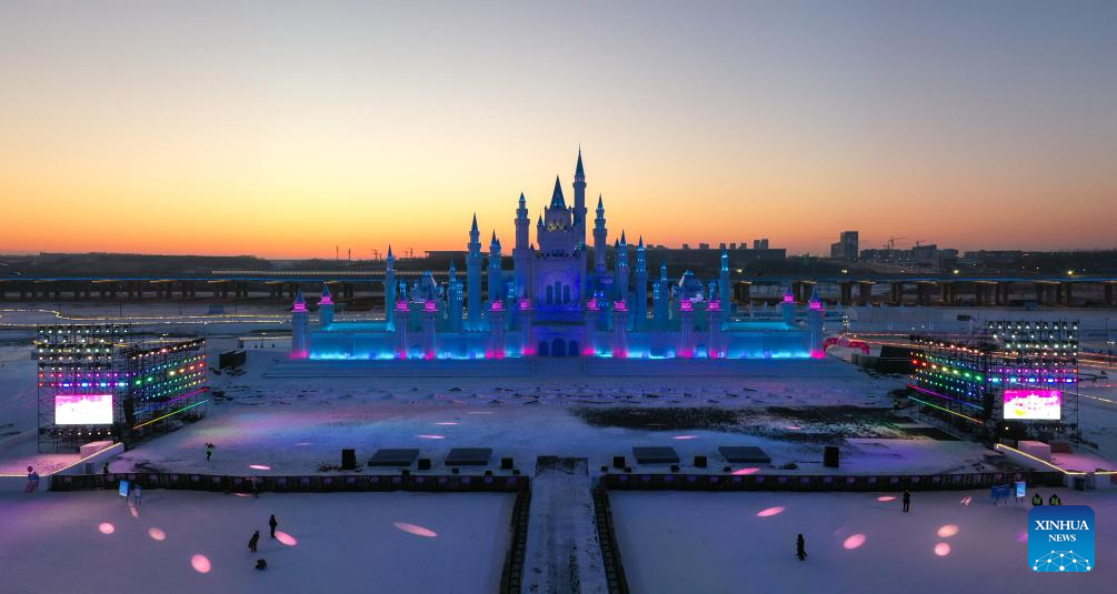 This aerial drone photo taken on Jan. 5, 2026 shows a park in Changchun, northeast China's Jilin Province. Changchun has set up a variety of distinctive ice and snow landscapes throughout urban areas this winter to lure tourists and encourage consumption. (Xinhua/Xu Chang)