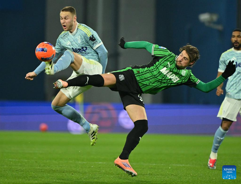 Juventus' Teun Koopmeiners (L) vies with Sassuolo's Andrea Pinamonti during a Serie A football match between Sassuolo and Juventus in Reggio Emilia, Italy, Jan. 6, 2026. (Photo by Alberto Lingria/Xinhua)