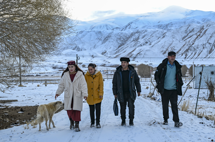 Duolaitiman Kaimike (second right), a village leader and National People's Congress deputy, chats with fellow villagers in Tashikuergan (Taxkorgan or Tashkurgan) Tajik Autonomous County, Kashi Prefecture, on January 3. [Photo/Xinhua]