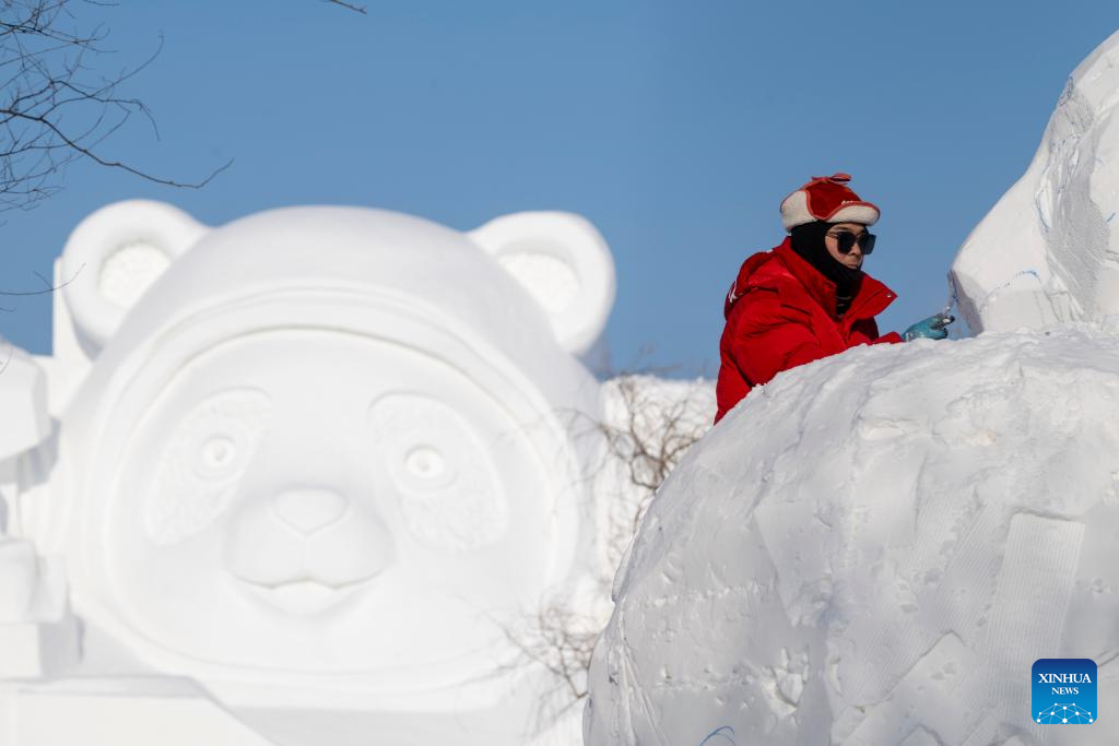 A contestant works on a snow sculpture at the compound for the Sun Island International Snow Sculpture Art Expo in Harbin, northeast China's Heilongjiang province, Jan. 7, 2026. The 28th Harbin international snow sculpture competition kicked off here on Tuesday, attracting 25 teams of snow sculptors from 13 countries. Various snow sculpture works have begun to take shape on Wednesday. (Xinhua/Zhang Tao)