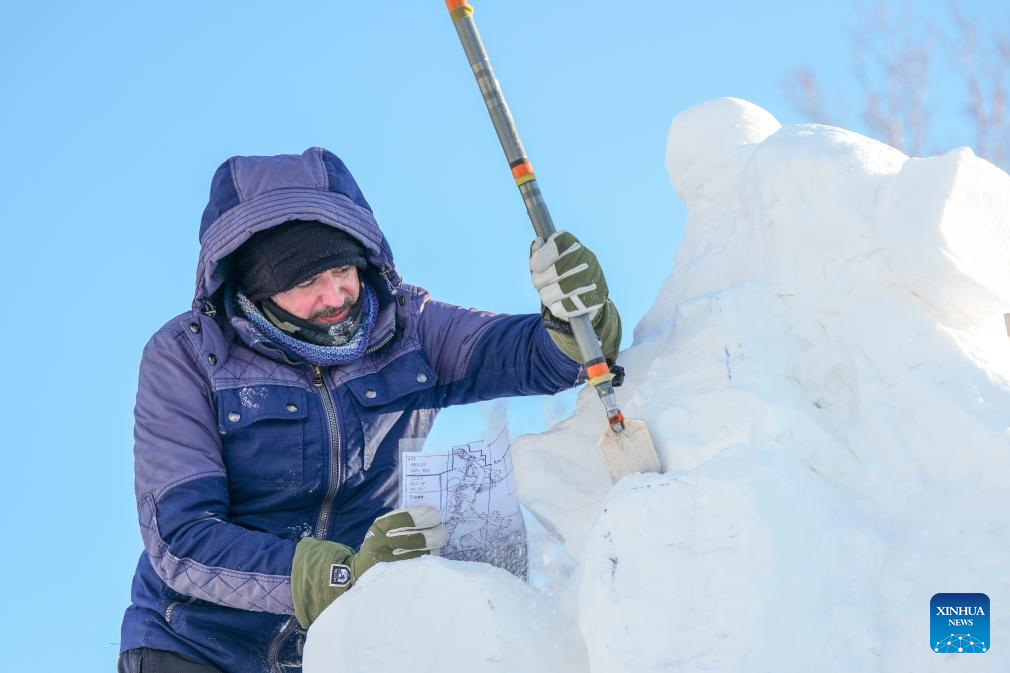 A contestant works on a snow sculpture at the compound for the Sun Island International Snow Sculpture Art Expo in Harbin, northeast China's Heilongjiang province, Jan. 7, 2026. The 28th Harbin international snow sculpture competition kicked off here on Tuesday, attracting 25 teams of snow sculptors from 13 countries. Various snow sculpture works have begun to take shape on Wednesday. (Xinhua/Wang Song)