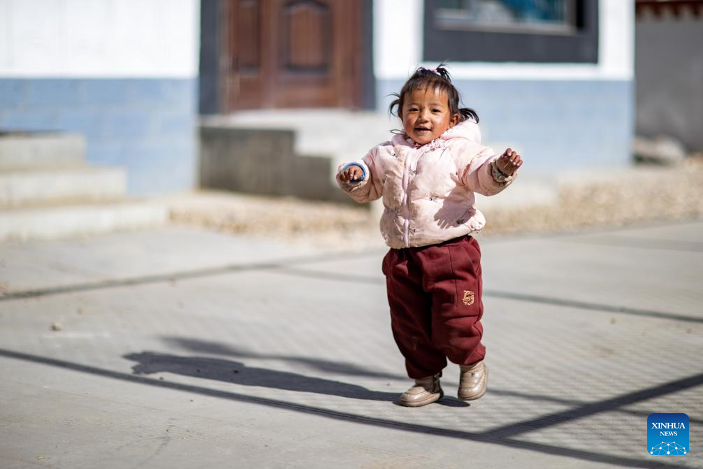 A girl is pictured in Zimgag Village of Chamco Township, in Dingri County of Xigaze City, southwest China's Xizang Autonomous Region, on Jan. 5, 2026. In January 2025, a 6.8-magnitude earthquake struck Dingri County in the city of Xigaze, leveling thousands of houses.