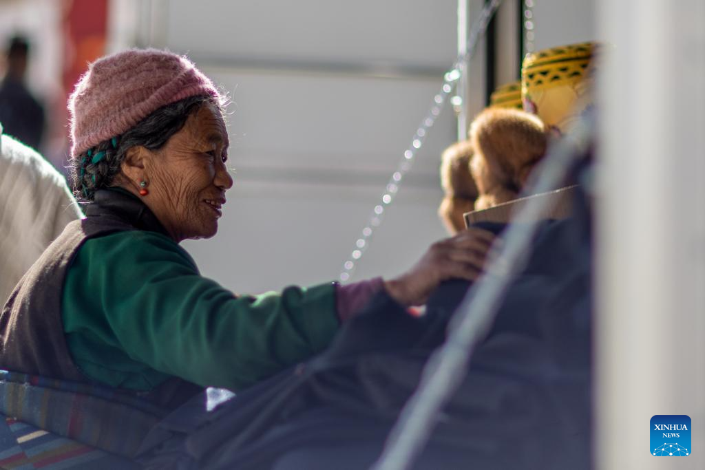 A villager selects clothes at a market in Zimgag Village of Chamco Township, in Dingri County of Xigaze City, southwest China's Xizang Autonomous Region, on Jan. 5, 2026. In January 2025, a 6.8-magnitude earthquake struck Dingri County in the city of Xigaze, leveling thousands of houses.