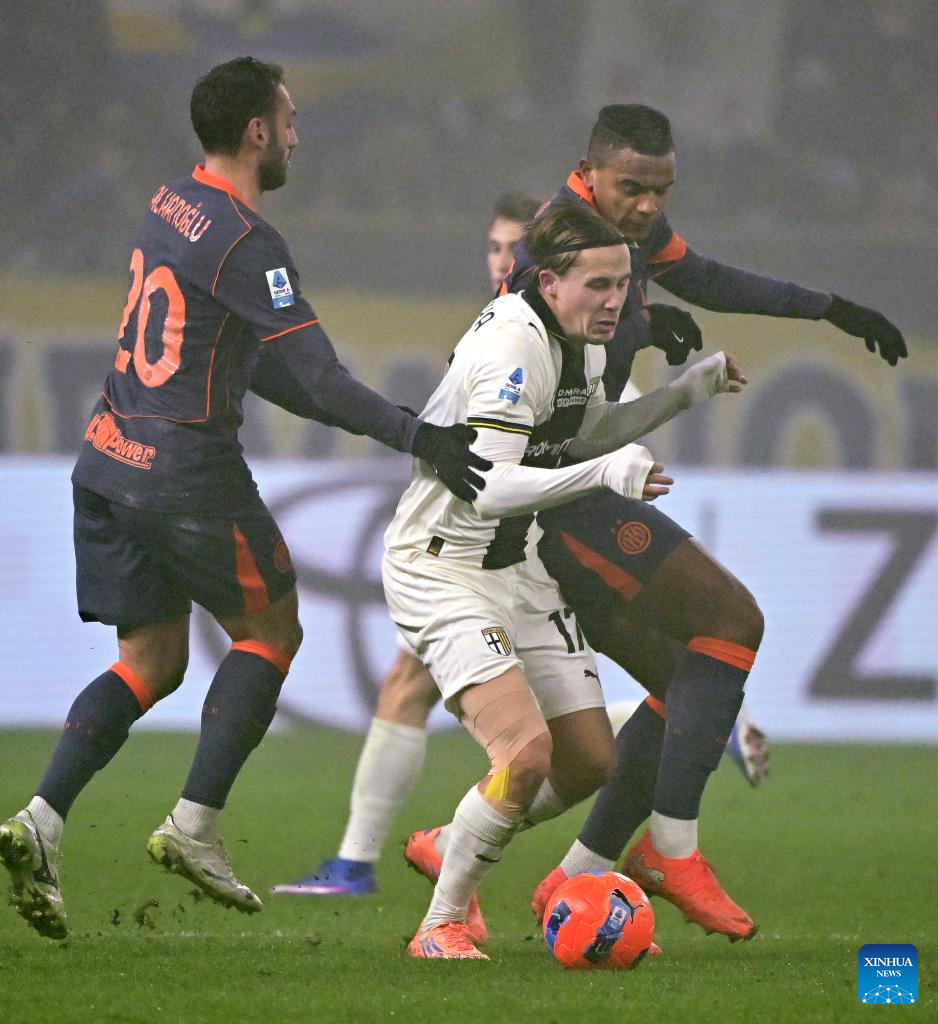 Inter Milan's Hakan Calhanoglu (L) and Manuel Akanji (R) vie with Parma's Jakob Ondrejka during a Serie A football match between Parma and Inter Milan in Parma, Italy, Jan. 7, 2026. (Photo by Alberto Lingria/Xinhua)