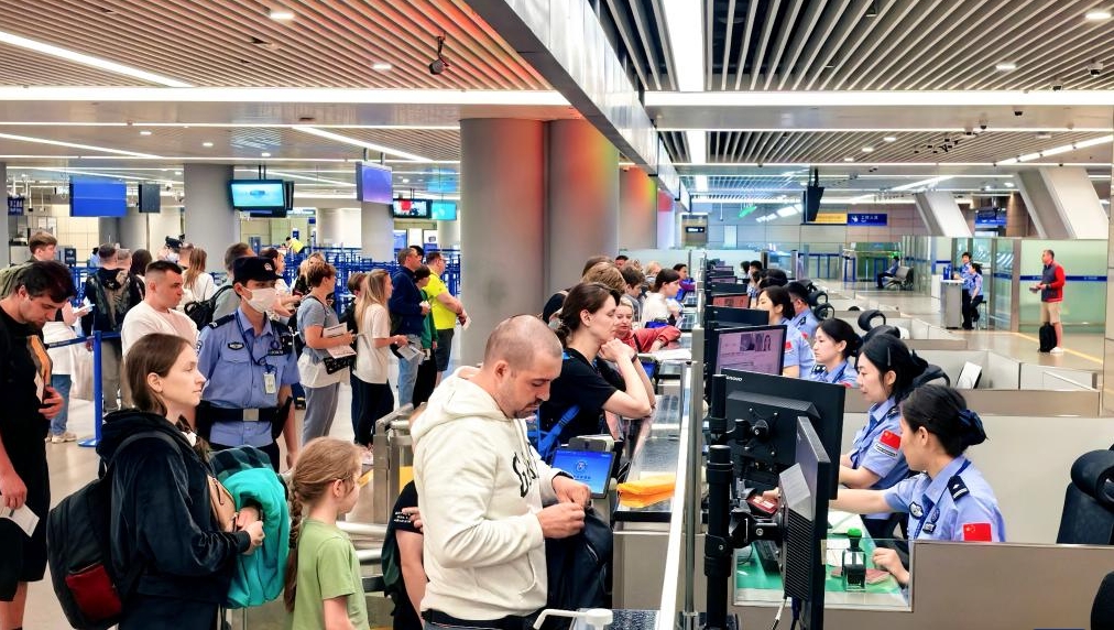 Inbound tourists go through border inspection check at Shanghai Pudong International Airport in Shanghai, east China, July 16, 2025. [Photo/Xinhua]