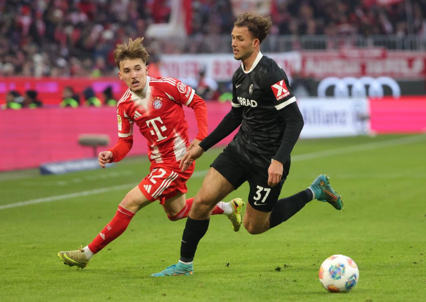 Lennart Karl (L) of Bayern Munich vies with Max Rosenfelder of SC Freiburg during the German first division Bundesliga football match between Bayern Munich and SC Freiburg in Munich, Germany on Nov. 22, 2025. (Photo by Philippe Ruiz/Xinhua)
