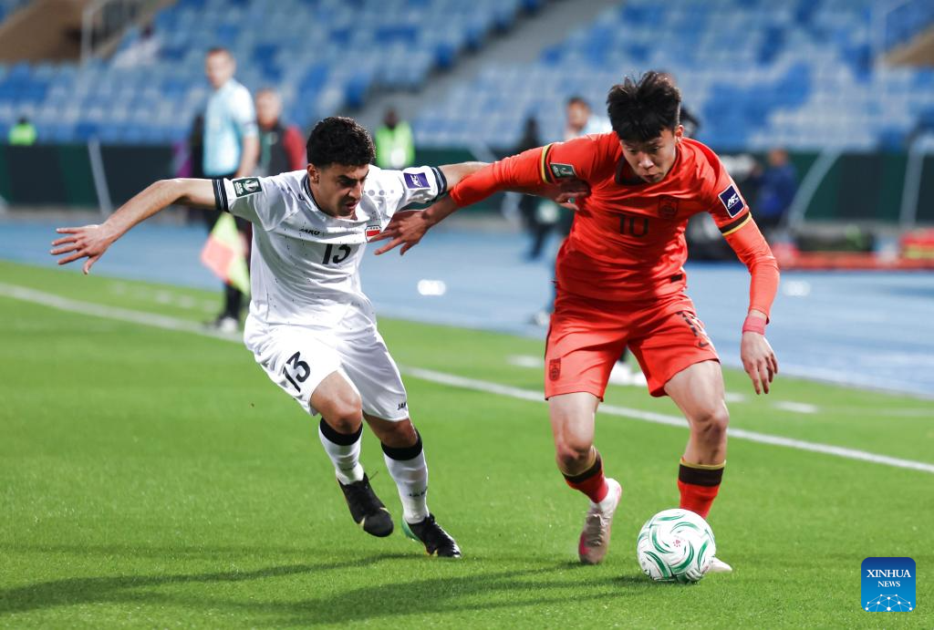 Wang Yudong (R) of China vies with Abbas Fadhil Abbas of Iraq during the 2026 AFC U23 Asian Cup group match between China and Iraq in Riyadh, Saudi Arabia, Jan. 8, 2026. (Xinhua/Wang Haizhou)