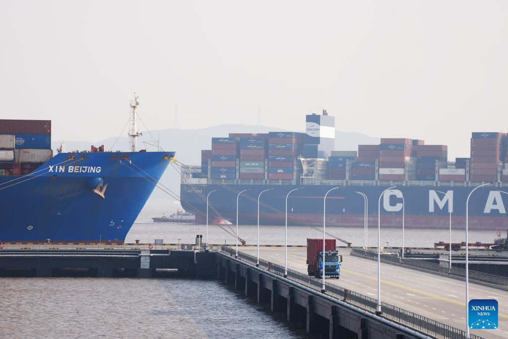 A cargo ship (L) berths at the Meishan area of Ningbo-Zhoushan Port, east China's Zhejiang Province, on Jan. 8, 2026. (Xinhua/Huang Zongzhi)