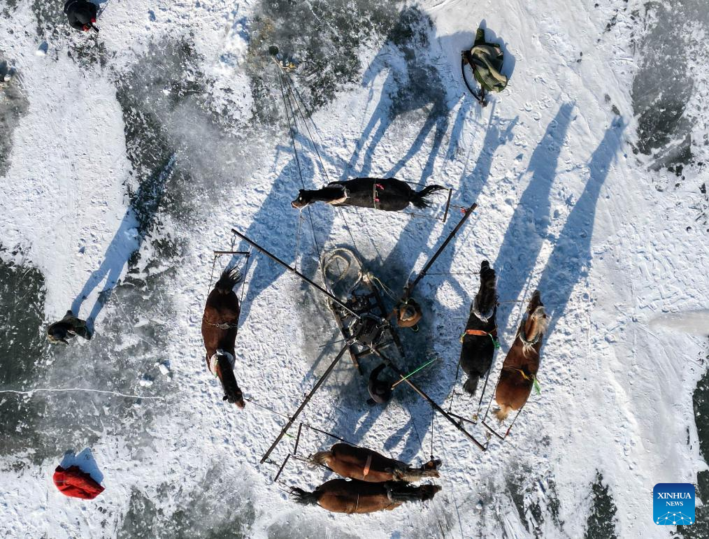 An aerial drone photo taken on Jan. 7, 2026 shows horses drawing a winch for net-hauling on the ice-covered Chagan Lake in Songyuan, northeast China's Jilin Province. The 24th Chagan Lake Ice and Snow Fishing and Hunting Cultural Tourism Festival opened here on Thursday. Traditional fishing techniques are performed on the lake, such as manual ice-chiseling, horse-drawn winches, and net-hauling beneath the ice-cover lake. Chagan Lake's ice fishing, a national intangible cultural heritage, has become a significant symbol of ice and snow culture in northeast China. (Xinhua/Yan Linyun)