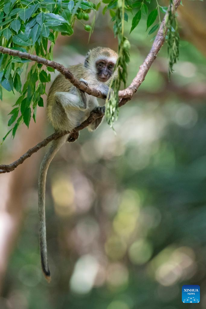 This photo taken on Jan. 8, 2026 shows a vervet monkey at the Amboseli National Park in Kenya. Amboseli National Park is one of Kenya's premier vacation destinations and a world-renowned tourist spot. The park is located at the border between Kenya and Tanzania and sits at the foot of Africa's highest mountain, Mount Kilimanjaro. (Xinhua/Xie Jianfei)