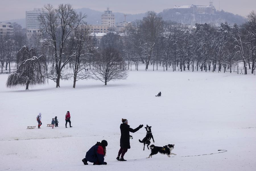 People play in snowy weather in Ljubljana, Slovenia, Jan. 9, 2026. (Photo by Zeljko Stevanic/Xinhua)
