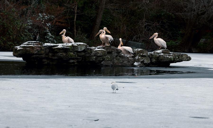 Pelicans are seen on the rocks surrounded by the frozen surface of the lake at St. James's Park in London, Britain, Jan. 6, 2026. (Xinhua/Li Ying)