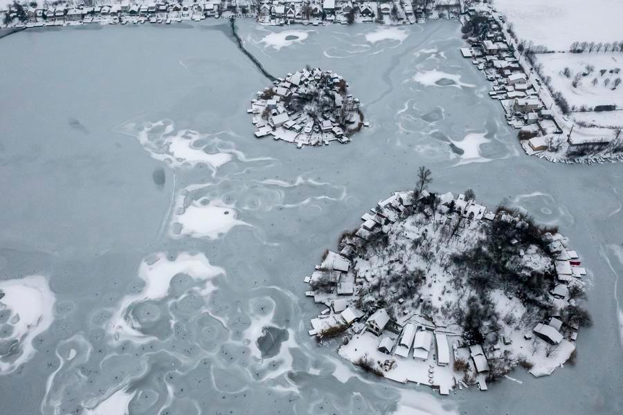 An aerial drone photo shows the frozen Kavicsos Lake in Budapest, Hungary, Jan. 9, 2026. (Photo by David Balogh/Xinhua)