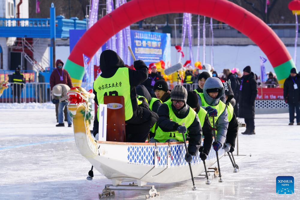 Students from Harbin Institute of Technology (HIT) compete during the "HIT-Cambridge-Oxford Cup" Ice Dragon Boat International Friendship Race in Harbin, northeast China's Heilongjiang Province, Jan. 10, 2026. (Xinhua)